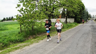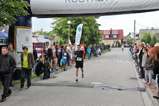 Kostrzyn godzina 14:00 i ruszamy na trasę dziesiątki, ustawiony gdzieś w połowie stawki ruszam jak w Swarzędzu na 4:30'/km (pierwsze 4km tendencja spadkowa - 4:23,4:36,4:36, 4:42), garmin partneruje ale od początku tygodnia już nieźle dałem sobie w kość na moim ostrym kole i już od 4km czułem swoje nogi a właściwie łydki, dlatego postanowiłem biec na tętno 170-180 i ewentualnie wyznaczać sobie cele i je doganiać, przed nawrotem byłem 86 i tempo mi spadło na jakieś średnio 4:45'/km i nie byłem z siebie zadowolony ale czego miałem się po swojej postawie spodziewać :P, brak treningu, "hardcorowa" jazda rowerem, musiało tak być, 7,8 i 9km leciałem za trójką zawodników których musiałem minąć przed metą, a że na początku ostatniego kilometra był podbieg a mi jakoś one nie szkodzą to i tak się stało, potem jeszcze jeden zawodnik i na koniec chciałem dogonić jeszcze jednego z "Walki Kostrzyn" przy którym leciałem chyba gdzieś od nawrotki ale ładnie przyśpieszył na ostatnim kilometrze na podbiegu (czego dowodzi zdjęcie zapożyczone z fanpejdżu Walki Kostrzyn) i wbiegł na metę chyba z 10 sekund przede mną, mijając jeszcze kogoś z "Drużyny Szpiku", brawa.