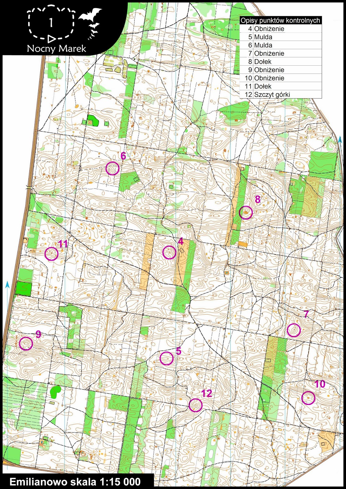 Chwila namysłu, na górce przed wejściem zebrało się kilkanaście osób i każdy obrał swój wariant przebiegu, my chyba jako nieliczni albo i jedyni wybraliśmy wariant 6-8-4-11-9-5-12-10-7 także dlatego by nie zbiegać się z innymi na każdym punkcie tylko samemu je odnajdywać i tak 6PK (9'), poszło łatwo, bieg wzniesieniem i jesteśmy, dalej trochę biegu ścieżkami, przelot przez gęsty lasek a właściwie przedarcie się i jest dołek a w nim punkt 8PK (15'), dalej wybiegamy na "autostradę" wśród tych wszystkich ścieżek aż pod spore podejście na którym jest punkt 4PK (11') oznaczony jako obniżenie, szkoda tylko że na sporej górce musiało znaleźć się to obniżenie :), podbijamy i dalej do 11PK (19') a z niej już nie biegiem a spacerkiem przez las do 9PK (37') który przeszliśmy przez swoją niedokładność w czytaniu mapy, strata czasowa jak na nasze możliwości o 20 minut za dużo ale naprawiamy błąd wracamy przy płocie do odpowiedniego wzniesienia i tak jakieś 200 metrów od płotu w końcu jest punkt, a właściwie cały czas tu był tylko że wcześniej się przed nim rozeszliśmy na boki i zwyczajnie go ominęliśmy, dalej do kolejnego punktu prosto ścieżką z której odbijamy i jest 5PK (16'), potem kolejny 12PK (5') z które zbiegam w złym kierunku chyba przez moje wciąż nękające na podbiegach bolące kolano które nie daje mi myśleć jak widzi pagórki, wracamy na dobre tory i mamy 10PK (13') przed którą mijamy kilka osób a potem one gonią nas do 7PK (6') z którego czym prędzej się zwijamy do drogi na skraju mapy by w końcu wybiec z "Emilianowa" co zajeło nam 2h20min w ciągu których przedreptaliśmy 13km.