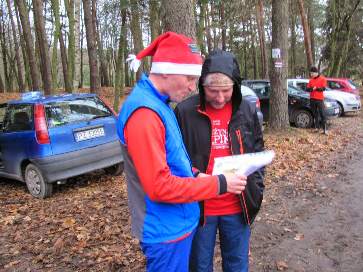 Pod koniec roku Hades przygotował prolog nowej serii grand prix na rok 2014, miejscem biegu był teren przy jeziorze Rusałka znany biegów Poznaj Poznań, zjechało się prawie 50 osób, na trasę główną wyruszyło 27, start masowy z niedalekiej odległości od parkingu przy jeziorze i od razu po chwyceniu mapy widzę że najbliżej jest PK42 ale chyba większość tam pobiegnie i będzie tłok więc podbije go przed metą, tak więc wybieram skręt w lewo i PK49 do którego drogą dobiegam pierwszy za chwile za mną dobiegają chyba z trzy osoby ale szybko się oddalam na PK41 i wszystko idzie dobrze z czytaniem mapy tylko moja ocena odległości po wybiegnięciu na ścieżkę trochę zawodzi bo chciałem ciąć pod górkę po skosie a wyszedł podbieg trochę za daleko i mało nie przeoczyłem punktu, za mną biegnie dwóch zawodników którzy cisną na PK40 ale ja chciałem najpierw podbić PK39 ale znów zawodzi ocena odległości i coś mi na skrzyżowaniu nie pasuje więc spadam stąd na czterdziestkę i już wiem że szukałem wcześniej za blisko ale naprawiam swój błąd, jak dobrze pamiętam to odbiegając od punktu widzę dobiegającego Błażeja z Hadesu który dobiega do punktu, ja lecę na skrajne punkty PK38 i PK37 a potem na to "pole z okopami" gdzie podbijam PK34-35-36 i znów dogania mnie Błażej który wyprzedza mnie po PK33 i na PK32 jest już przede mną, jednak przed wybiegiem na drogę popełnia mały błąd i teraz mnie ściga chyba z Krzysztofem (który później wygra) przez PK31 a na PK43 znów są przede mną, moja kondycja to tragedia jakaś mówię sobie i zasuwam na PK46 przy stawku i PK47 w lesie gdzie Panowie na dobre mi uciekają wybierając bieg inną ścieżką niż ja który za chwile o mało się nie zamotał w ilości mijanych ścieżek :) zatrzymuję się spoglądam na mapę podnoszę wzrok i widzę biegnącego Krzycha który rzuca mi trzy słowa "tak to tam" i faktycznie przede mną jakieś 20 metrów w dziurze schowany był PK45 którego od mojej strony nie było widać z tej odległości, potem co sił w nogach biegnę na PK44 w miejsce gdzie na biegu PP także znajdował się PK i sporej ilości zawodnikom tak jak i wtedy Lence i mnie sprawił on bardzo dużo problemów, jednak tym razem teren w koło jest wykoszony i oczyszczony z krzaków, po podbiciu pozostaje punkt przy boisku do siatkówki po którym wyprzedza mnie zawodnik ale nie kojarzę czy odbił konkretnie na metę czy jeszcze coś szukał ale mógł być to drugi na mecie Jacek, ja wybiegam na ścieżkę przy parkingu i dopiero spostrzegam że właśnie na nim jest meta a nie przy starcie tak więc trzeba będzie podbić i zrobić nawrotkę, w tym momencie do mety z PK42 biegnie już Błażej który tempo utrzymał do końca i wyprzedził mnie o 2 minuty, ja jeszcze lecę podbić ten nieszczęsny PK42 i wbiegam na metę jako 5 zawodnik a chwile po mnie wbiega z innego kierunku Krzychu.