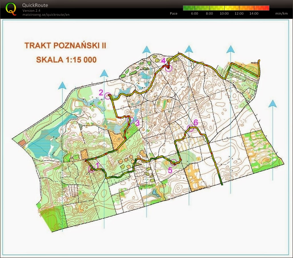 Po dotarciu do drugiej mapy BnO - "Trakt Poznański II" postanowiłem pobiec według schematu PK4, potem PK2 na górce, PK3 przy granicy kultur, dalej PK1 pomiędzy przecinkami, dalej między gęstwiny do PK5 i znów w nieckę do PK6, lepszego schematu nie mogłem sobie wybrać tak więc byłem zadowolony i wybiegłem na dużą mapę w kierunku PK10.