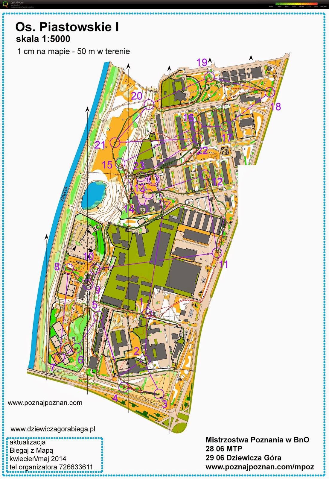 Osiedle na rogu ronda Starołęki, start umiejscowiony przy szkole pośrodku osiedla,czekając na start naoglądałem się błędów popełnianych przez innych zawodników, którzy nie zauważali płotu nie do przejścia aż w końcu sam wystartowałem i wybrałem trochę gorsy dobieg do PK1 bo bliżej Warty przez co trzeba było zbiec po schodach i po nich wbiec zamiast całej trasy po płaskim przebiec, ale co tam lecę dalej do PK2 pośrodku ogrodzeń gdzie także można było się pomylić, dalej łatwe PK3-PK5 i wbiegam na znajomy mi kompleks boisk na którym co tydzień grywam w piłkę, tak więc PK6-PK10 poszły nieźle poza PK9 którego szukałem na schodach zamiast pod schodami przez co straciłem trochę. Do PK11 był długi przebieg a potem punkty blisko startu gdzie inni popełniali błędy ale mi udało się spokojnie je podbić. Kolejne punkty według optymalnego wariantu, dopiero z PK21 wybrałem gorszy wariant dobiegu ale potem już prosto do mety. Wyszło 6,4km i 33 miejsce na 77 startujących.