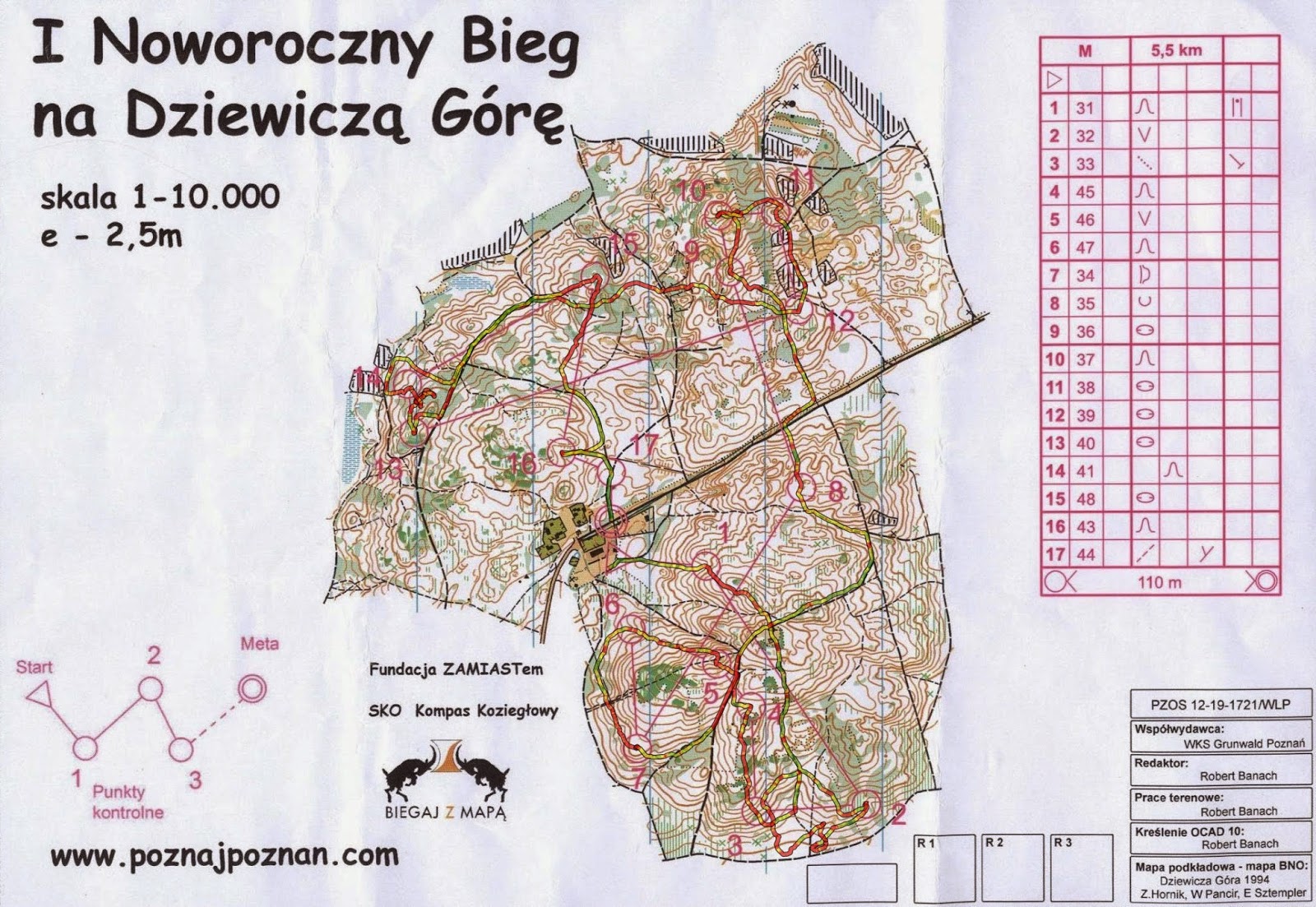 Pierwsza edycja sylwestrowo-noworocznych biegów na orientację na Dziewiczej Górze przyciągnęła około 30 zawodników na wszystkie trasy, ja wystartowałem na trasie elity, po starcie 1PK znajdował się na podbiegu, 2PK na zbiegu a 3PK mnie zmiażdżył :), zupełnie źle szukałem go poniżej gęstwiny i dopiero lecący za mną Marek mnie na niego nakierował, kolejne punkty od 4PK-9PK brałem na azymut i dopiero 10PK mi nie wszedł, potem 11PK i 12PK w miarę spokojnie choć ta góra i kolejny przebieg na 13PK dały mi w kość przez co 14PK szukał niepotrzebnie na górce, do 15PK trafiłem łatwo potem zamiast do ścieżki której nie widziałem zacząłem przechodzić przez las i już mnie trochę to męczyło ale 16PK i ostatni 17PK zrobiłem już na speedzie ale powiem tak, ta góra za każdym razem mnie wykańcza :)